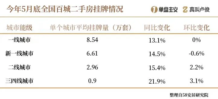 其中一线城市挂牌增加了13%,新一线14%、二线城市也有15%,三四线直接逼近22%