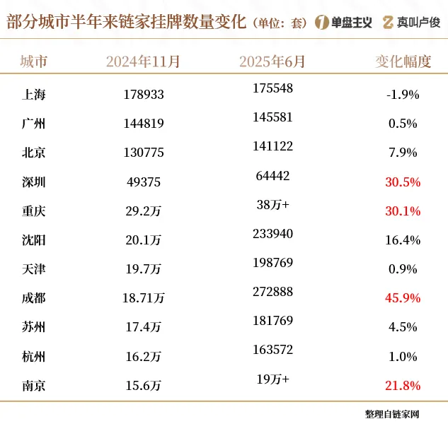 又过了半年时间,多个城市的链家挂牌量还在增加