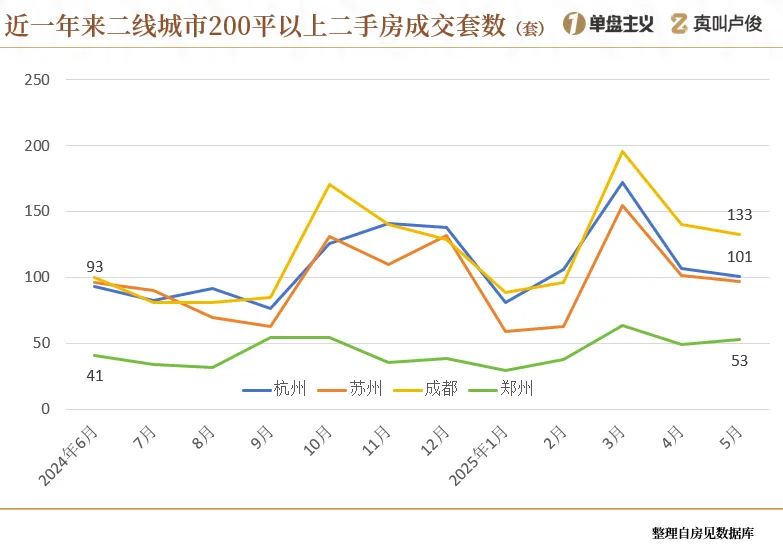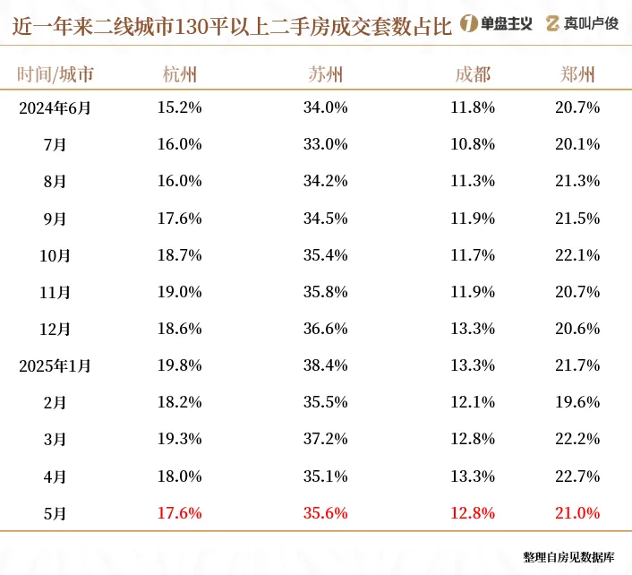130平以上的房源成交,杭州、苏州、成都和郑州都有所抬头