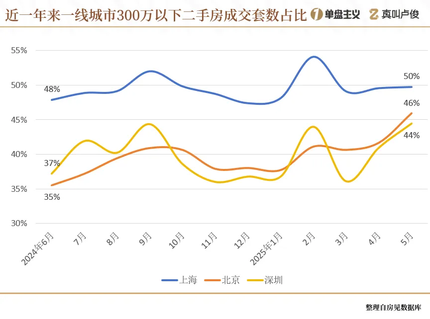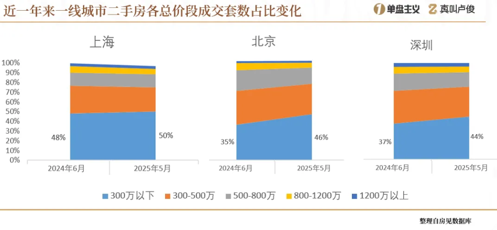 一,一线城市的二手结构,以300万以下的低总价房源成交为主